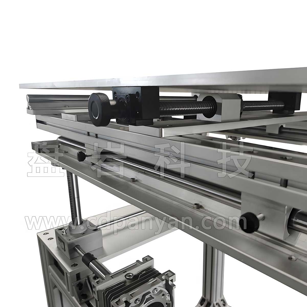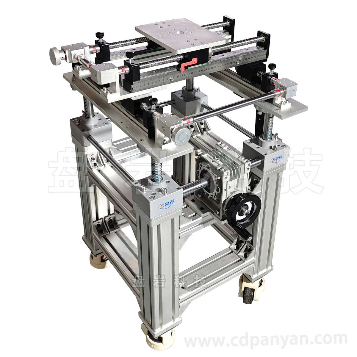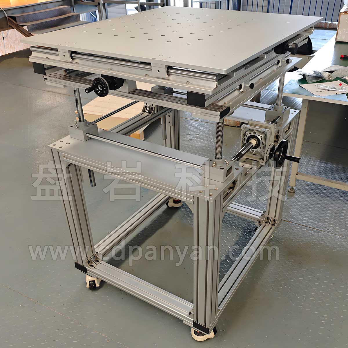 这是一款非常值得推荐的一款丝杆升降XYZ方向运动平台,为成都某核试验机构定制,设计工程师根据需求选用的盘岩科技标准款PKH40组合搭建的T型模组,上面承载一个铝合金平台,下面链接了一个蜗轮蜗杆顶升机构,底部搭建铝型架+滑轮,实现了平台的前后、左右、上下不同方向的移动,很好的解决了客户需求。