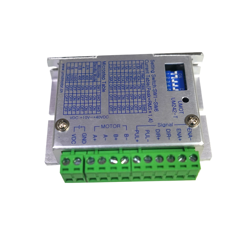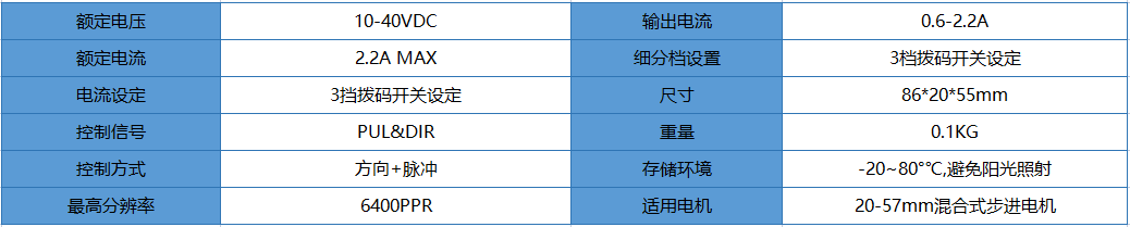 4、具备脱机功能,适配电流小于2.2A及以下步进电机。3挡输出相电流设置,自动半流功能,3挡细分设置,最大32细分,满足各种机械传动。