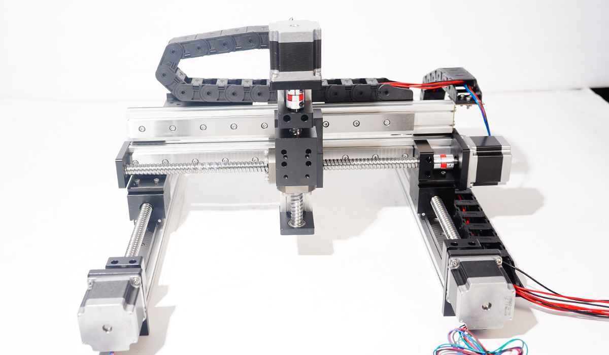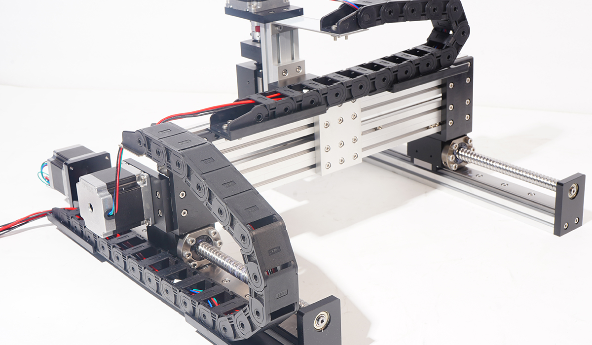 PKH40XYZ-L开放式滚珠丝杆三轴滑台是由PKH40系列直线模组搭建而成的龙门三轴运动系统,实现三维空间运动。采用开放式结构,配置24MM宽轨,单滑块,宽轨+丝杆两端均采用轴承固定以提高稳定性。适用于中低负载中等速度要求,由于直线模组为开放式无防尘防水功能,在一般环境下使用的条件,这个款模组最大优点性价比很高,龙门结构稳定,可自由搭建各种多轴滑台样式。
